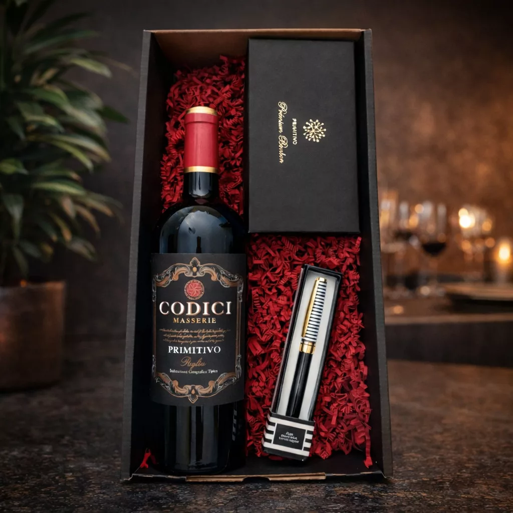 A csomag egyik legértékesebb eleme a Codici Primitivo Puglia minőségi olasz vörösbor, amely Dél-Olaszország híres borvidékéről származik.