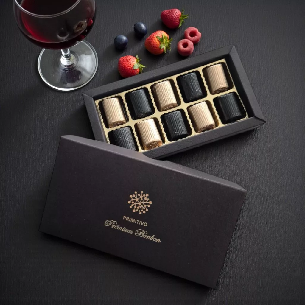 A gondosan megalkotott kézműves bonbonok a Primitivo szőlő karakteres ízvilágát tükrözik, tökéletes összhangot alkotva a mellékelt borral.
