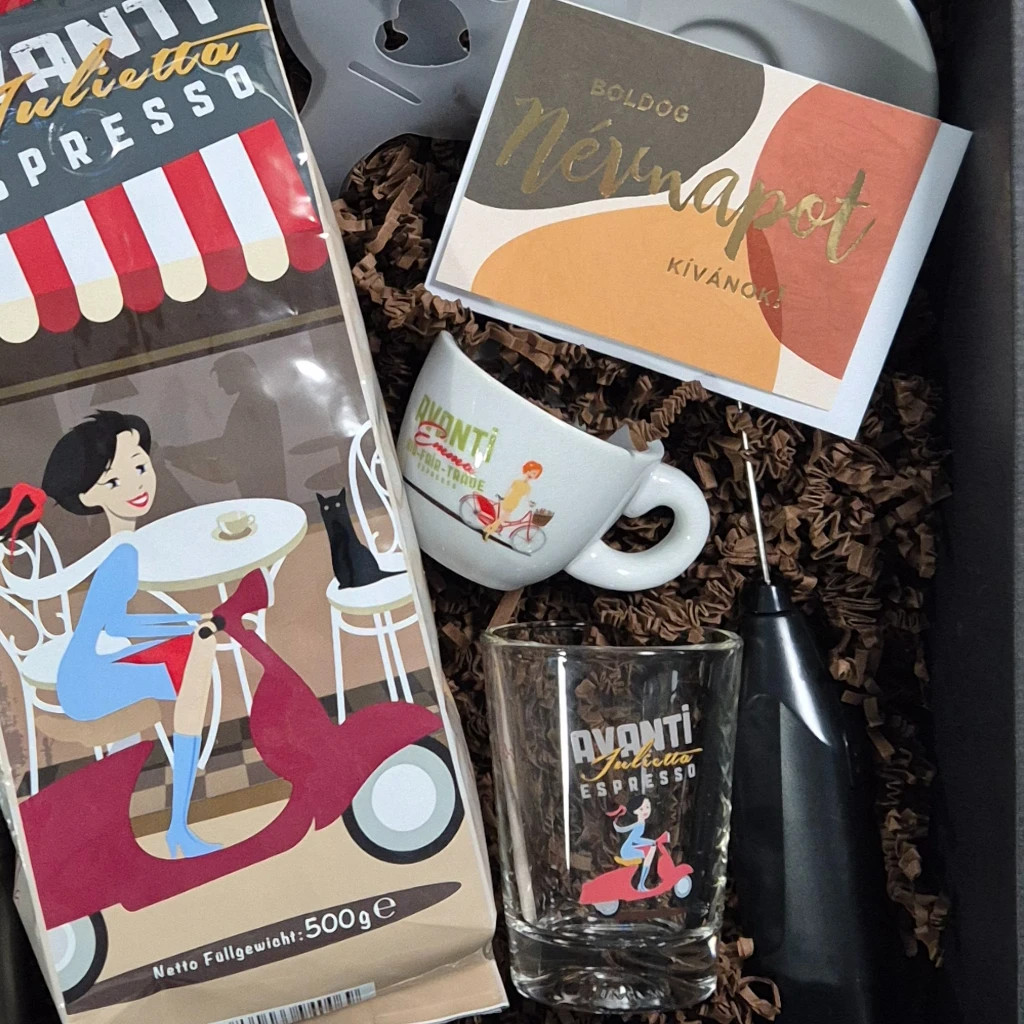 A Névnapi Avanti Espresso Élmény Ajándékcsomag egy gondosan összeállított, stílusos válogatás azok számára, akik az olasz eszpresszó világát nemcsak inni, hanem megélni is szeretnék.