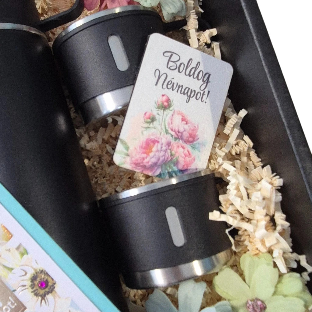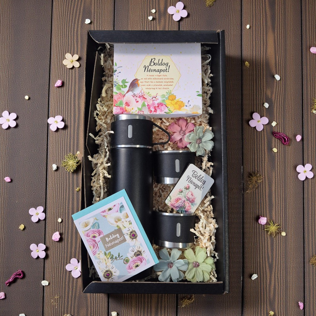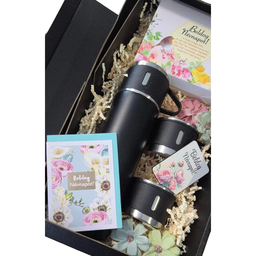 A letisztult fekete termosz, a hozzá tartozó poharak és a névnapi üdvözlőkártya együtt egy olyan ajándékot alkotnak, amely egyszerre hasznos és figyelmes.