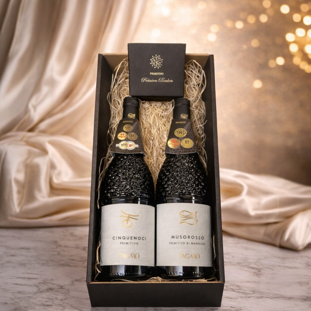 A gondosan összeállított válogatás két karakteres Primitivo vörösbort és egy elegáns Primitivo Premium Bonbon dobozt tartalmaz, igényes díszdobozos kivitelben.