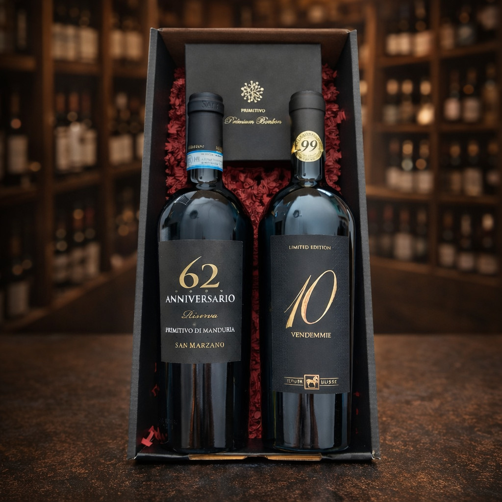 A gondosan válogatott tételek – a San Marzano 62 Anniversario Riserva Primitivo di Manduria és a Tenuta Ulisse 10 Vendemmie Limited Edition – együtt egy igazán különleges, magas presztízsű ajándékot alkotnak.