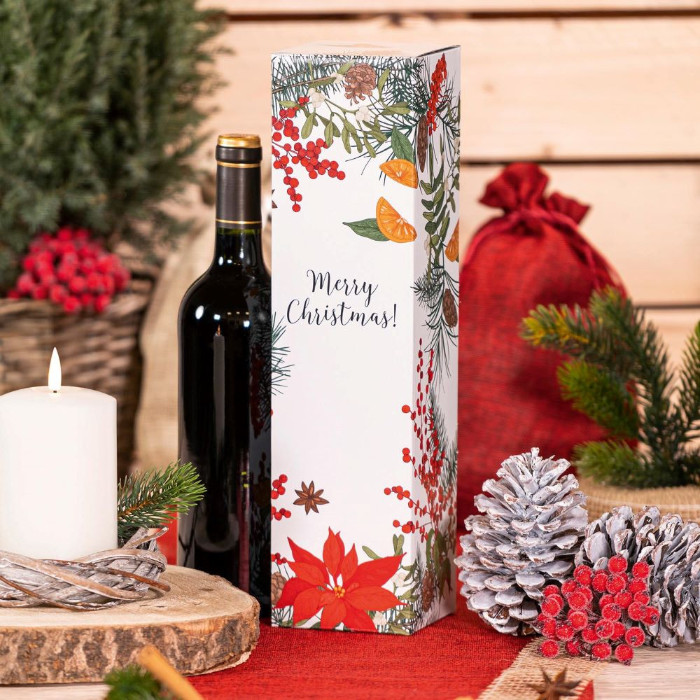 Az ünnepi „Merry Christmas” díszdoboz tökéletes megoldás egy üveg bor vagy pezsgő elegáns csomagolására.