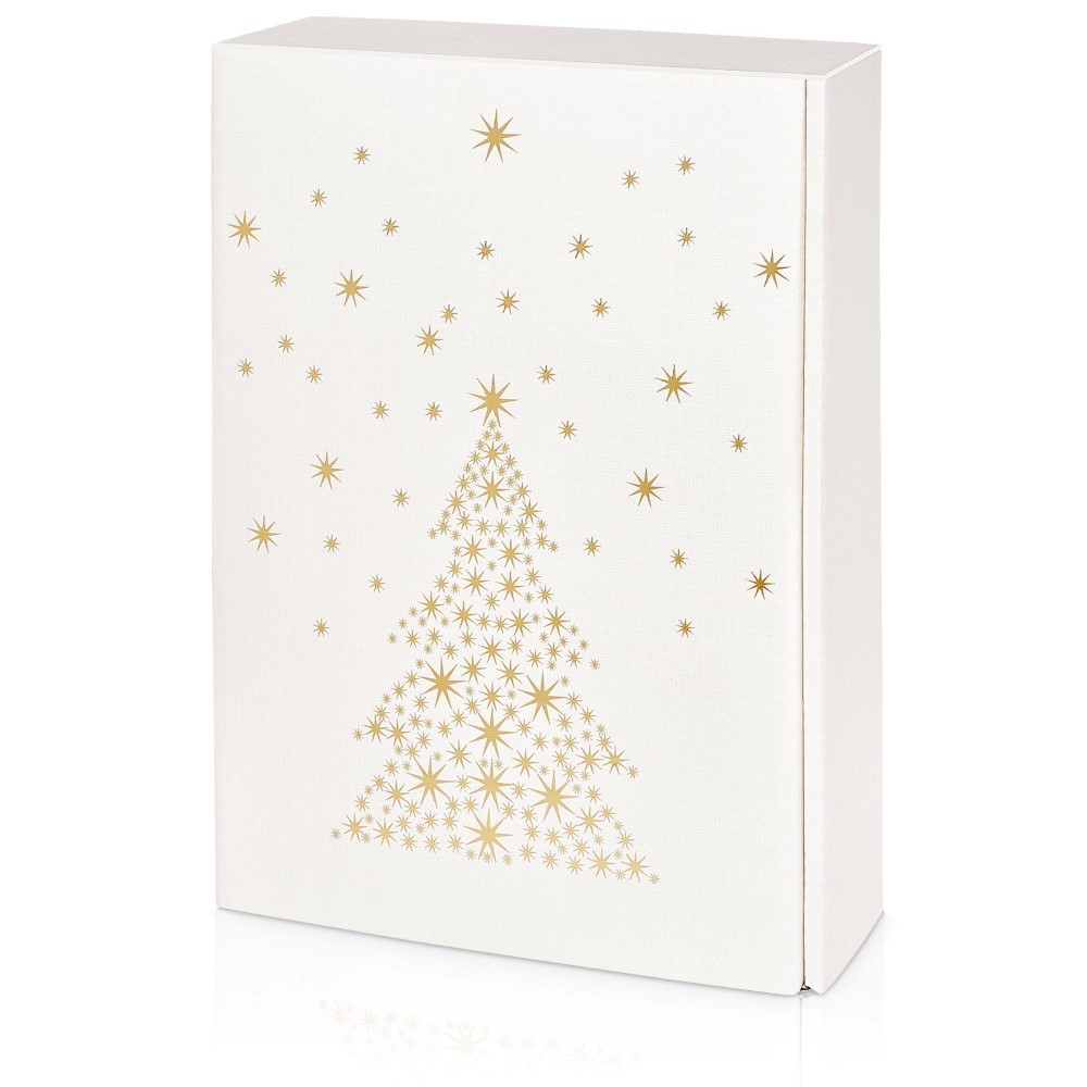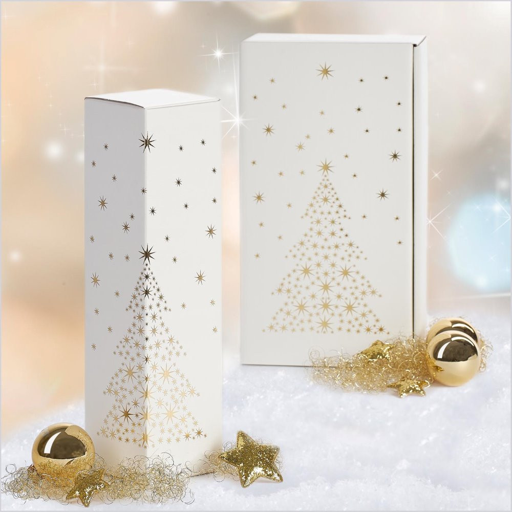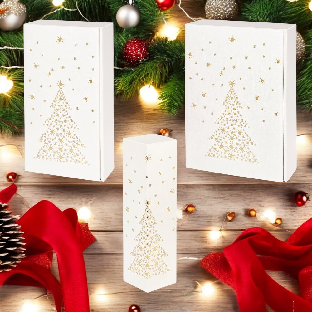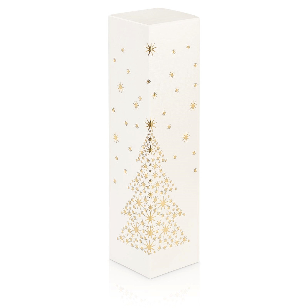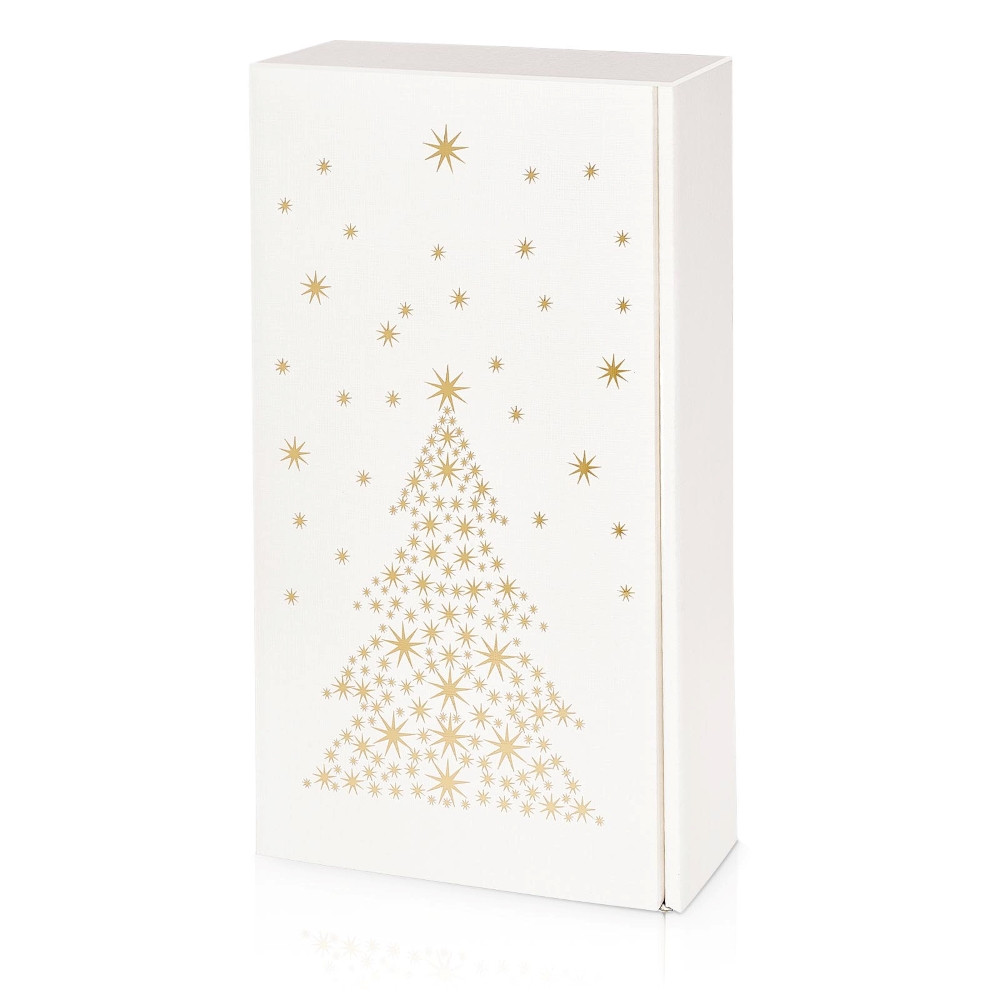 A „Fehér fenyőfás karácsonyi” díszdoboz egy elegáns megoldás egy üveg bor vagy pezsgő csomagolására (max. 355 mm hosszú palackhoz).